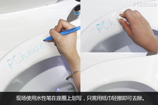 坐便盖板外壳采用高抗菌耐变黄的PP材料,触感光滑细腻,成色均匀洁白,使用了防火的材质,更加安全放心。编辑现场用水性笔在盖板上划写,只需轻轻用纸巾一擦即可去除,表面依旧光洁如新没有留下任何痕迹,由此可见其耐脏和自洁程度非常高。