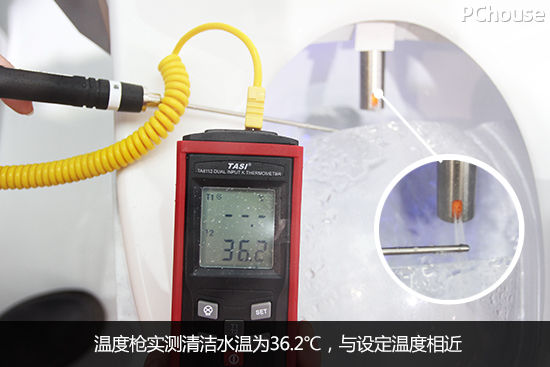 经过编辑在现场的测试,按下便洗按钮等待喷头正常出水之后,使用温度计测量水温,遥控器设定温度为36.5℃,温度计实测温度显示为36.2℃,与设定温度数值接近(由于受现场环境和温度等条件影响,测量与实际温度稍有偏差)。