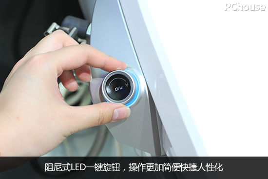 坐便盖板右边装有阻尼式LED七彩旋钮,左转是洗便功能,右转是妇洗功能,通过旋钮和轻拍两个动作一键式控制基本的功能操作,全面解决复杂难操作的问题。