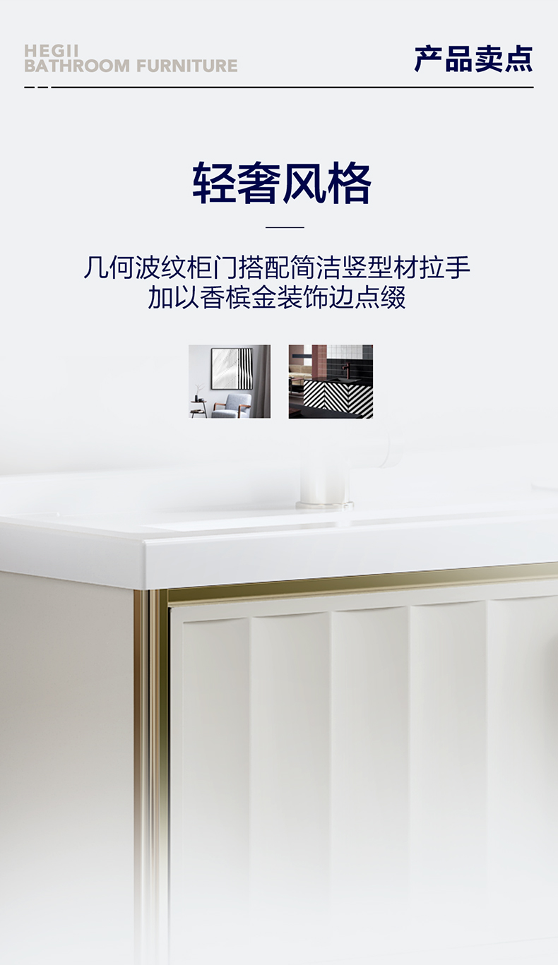 - 几何波纹柜门搭配简洁竖型材拉手,加以香槟金装饰边点缀。