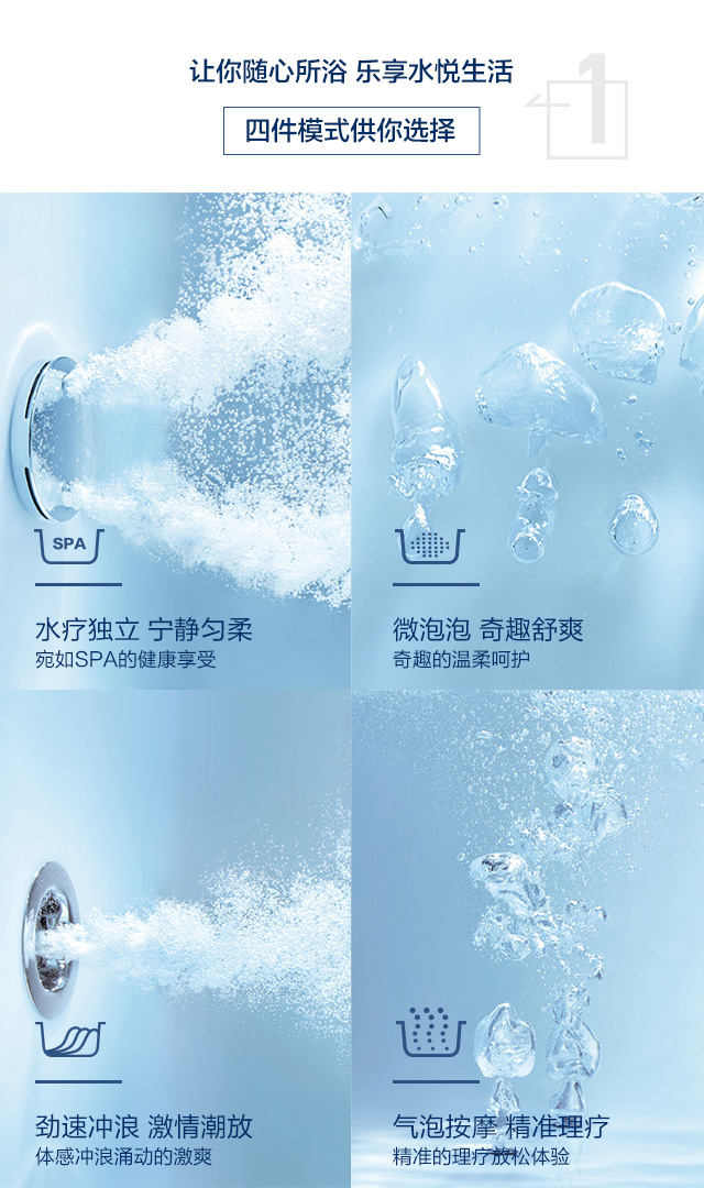 水疗独立按摩系统、劲速冲浪按摩系统、微泡泡按摩系统及汽泡按摩系统三件模式供你选择,让你随心所浴,乐享水悦生活